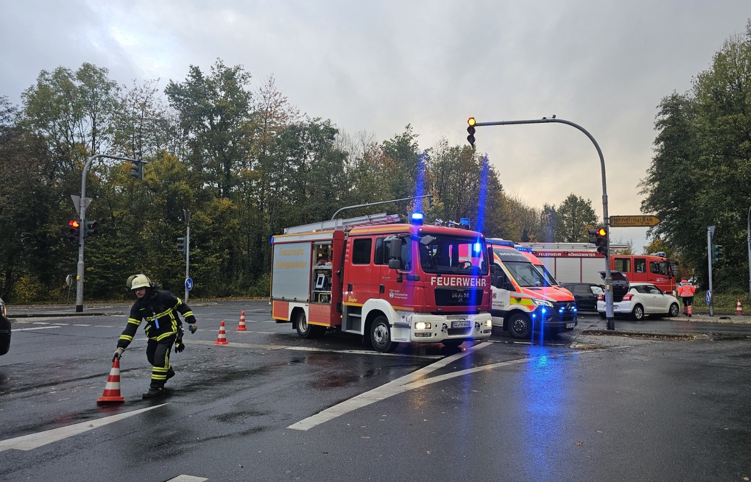 Bei dem Zusammenstoss von zwei Fahrzeugen auf der L143 wurden zwei Personen verletzt. Die Freiwillige Feuerwehr Königswinter sichert die Unfallstelle und streut Betriebsmittel ab. Um…