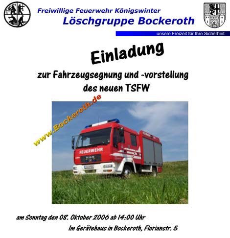 Am Sonntag den 08. Oktober 2006 hatte die Löschgruppe zu einer Feierstunde anlässlich der Segnung des neuen TSFW (Tragkraftspritzenfahrzeug) geladen. Auch sollte dieser Anlass interessierten…
