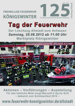 Der Löschzug Altstadt der Freiwilligen Feuerwehr Königswinter lädt im Rahmen seines 125jährigen Jubiläums zum Tag der Feuerwehr am Samstag, 25.August 2012 auf den Marktplatz vor…