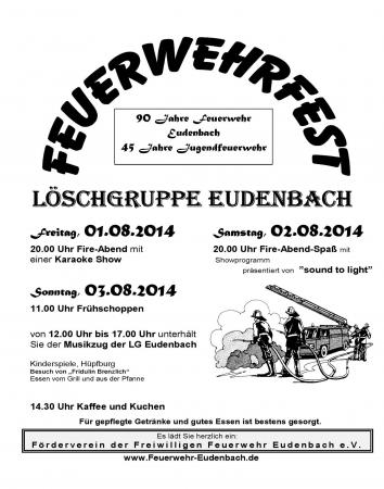Der Förderverein der Löschgruppe Eudenbach lädt zum Feuerwehrfest rund um das Feuerwehrgerätehaus von Freitag 01.August bis Sonntag 03.August 2014 herzlich ein.