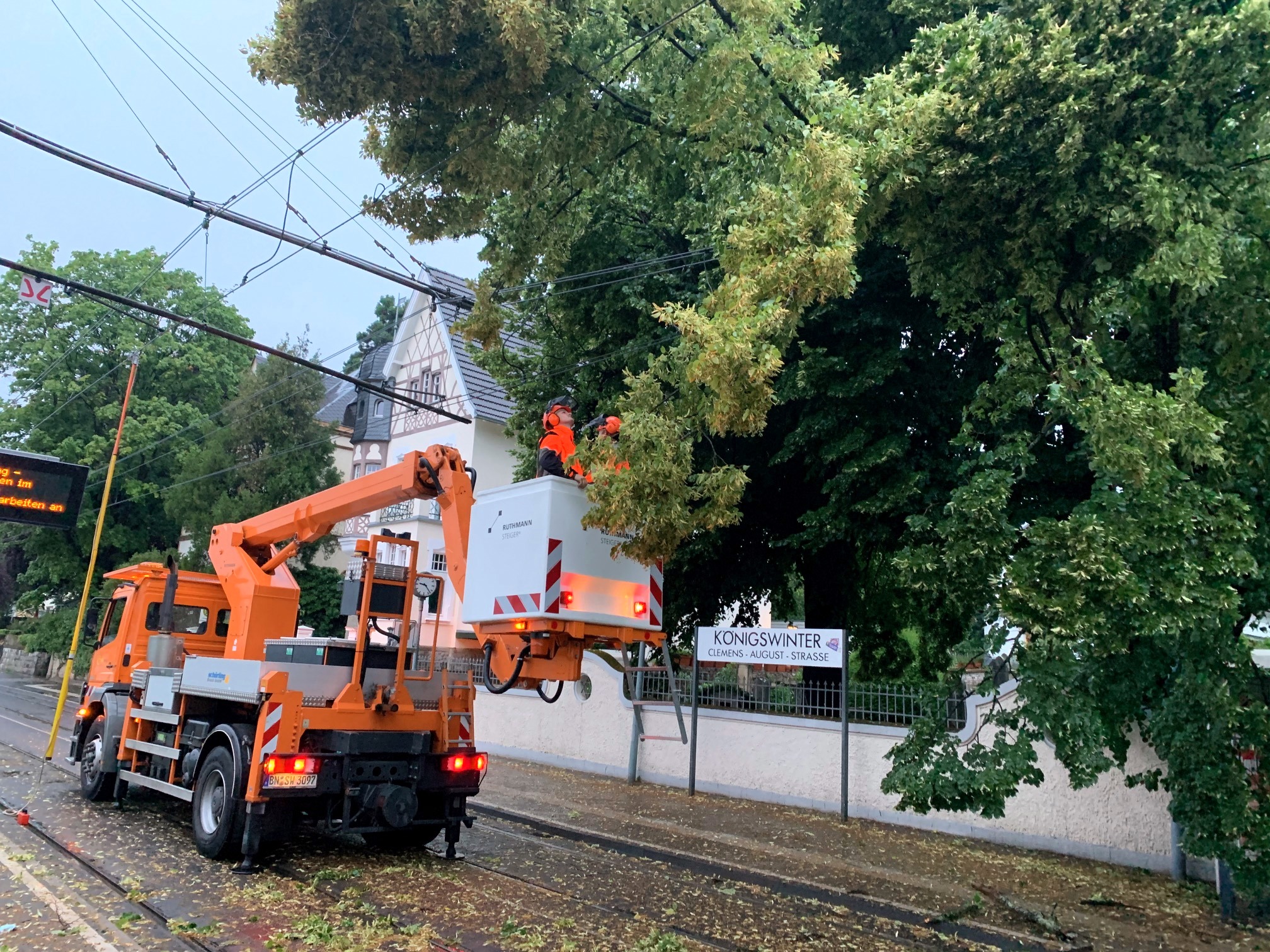 In Folge des Gewitters stürzten zwei große Äste auf den Fahrdraht der Linie 66 im Haltepunkt Clemens-August-Straße. Die Arbeiten zogen sich über mehrere Stunden hin…