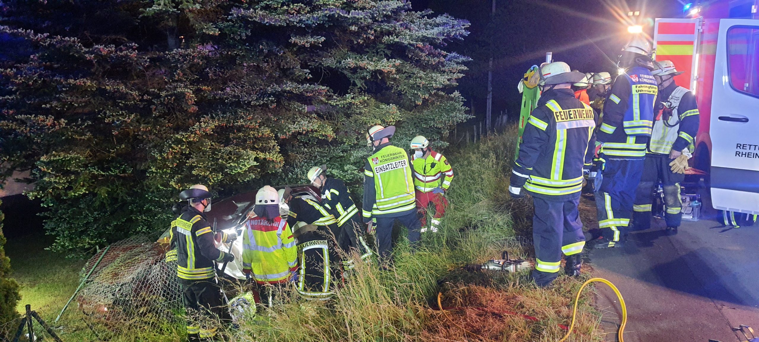 Nach einem Verkehrsunfall mit einem Rind auf der L 143 musste die Feuerwehr Königswinter einen Verletzten aus seinem deformierten PKW befreien. Um 22:14 Uhr am…