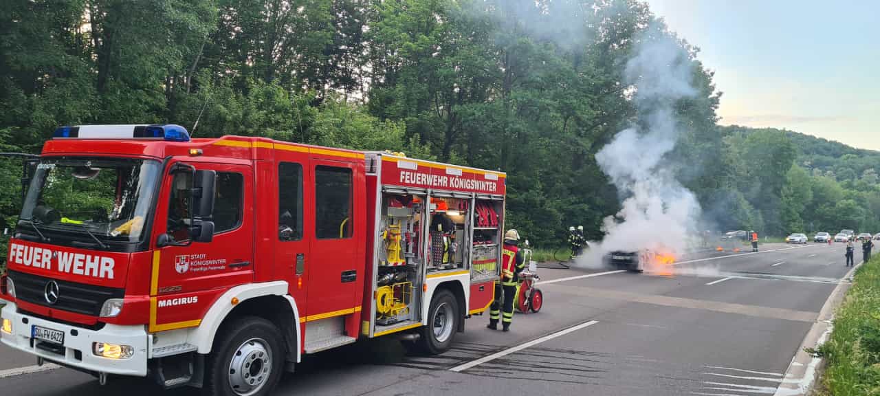 Zu einem PKW-Brand auf der Bundesstraße 42/A 59 im Autobahnkreuz Bonn-Ost wurde die Löschgruppe Niederdollendorf der Freiwilligen Feuerwehr Königswinter am Mittwochmorgen alarmiert. Bei Eintreffen stand…