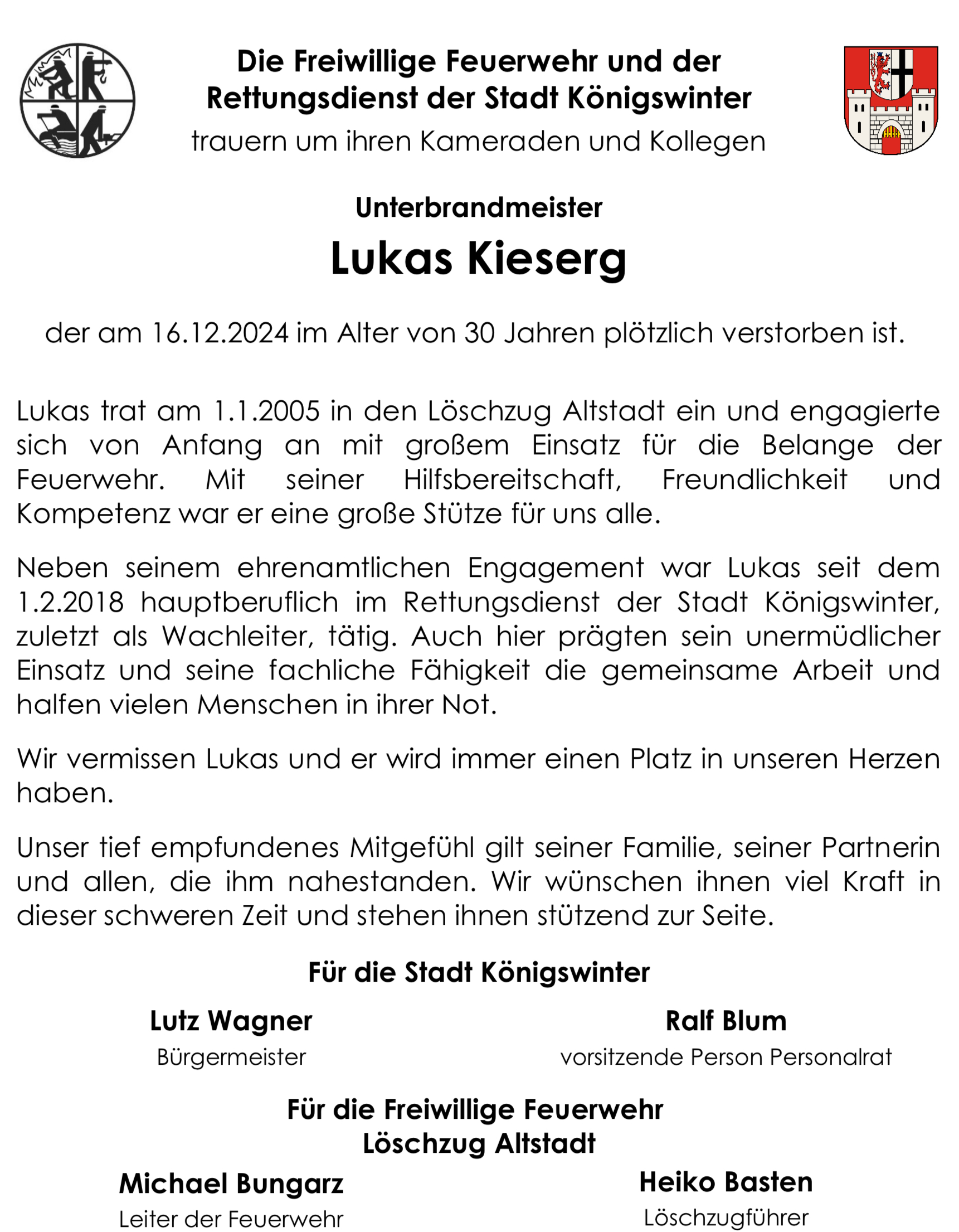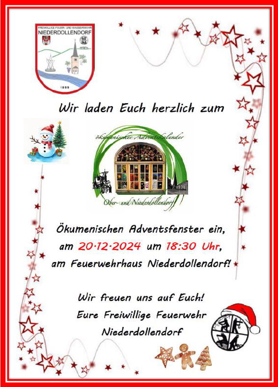 Am 20. Dezember öffnet die Löscheinheit Niederdollendorf der Freiwilligen Feuerwehr Königswinter ihr Ökumenisches Adventsfenster. Im Anschluss laden wir zu Kinderpunsch, Glühwein und Plätzchen ein.