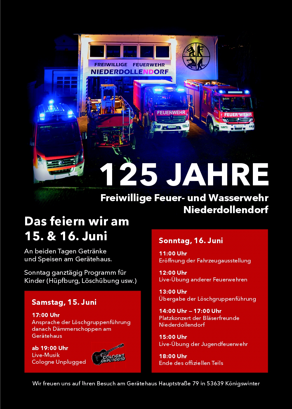 Großes Jubiläumswochenende am 15. und 16.Juni 2024 Die Löschgruppe Niederdollendorf feiert ihre Gründung vor 125 Jahren mit einem Dämmerschoppen am Samstag 15. Juni 2024 ab…