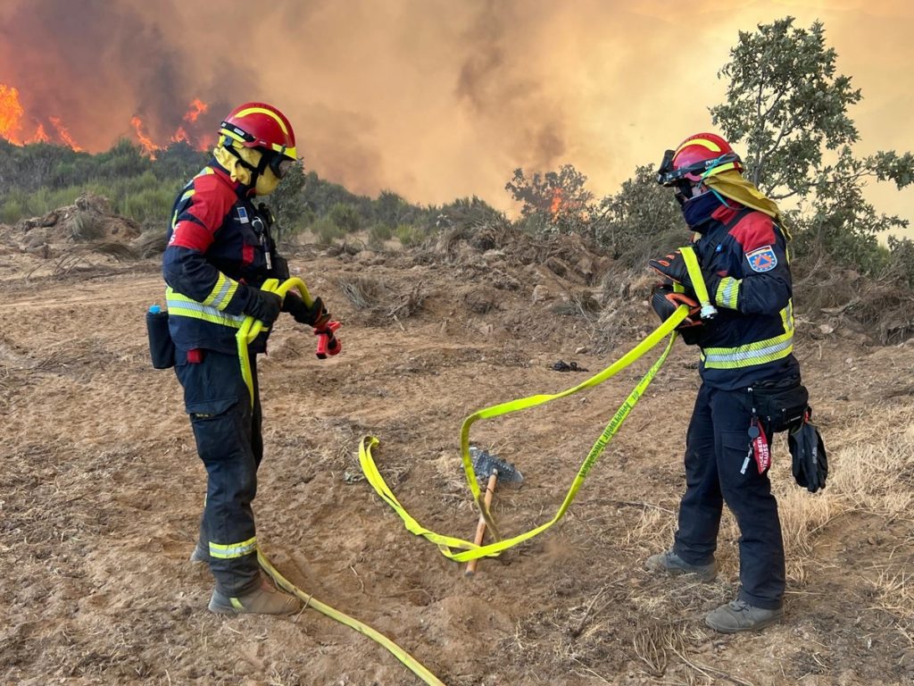 Ganz anders gestaltete sich der Sonntag. Unter anderem aufgrund sich drehender Winde entwickelten sich mehrere Einzelbrände ab Mittag zu einer kilometerlangen Flammenfront, die sich den gegenüberliegenden Abhang in Richtung des Dorfes ausbreiteten. Unmittelbar nach ihrem Eintreffen bekamen die Tanklöschfahrzeuge daher die ersten Einsatzaufträge. Gemeinsam mit anderen spanischen Einsatzeinheiten war unser Einsatzteam in beiden Dienstschichten gefordert. Durch den dynamischen Einsatz am Boden an drei Feuerfronten gelang es, den Ort La Baña gegen die Flammen zu verteidigen. Die notwendige Unterstützung kam hierzu auch aus der Luft: Mit bis zu sechs Löschflugzeugen und zehn Löschhubschraubern gleichzeitig konnten die zum Teil mehr als 50 Meter hohen Flammen verringert oder für Fahrzeuge und fußläufige Einsatzkräfte unerreichbare Bereiche abgelöscht werden. Unter Beobachtung zahlreicher besorgter Anwohner konnte so zunächst ein durch die starken Winde angefachtes, sich unkontrolliert ausbreitendes Feuer unter anderem am Überspringen einer wichtigen Straße gehindert werden. Zudem positionierten sich mehrere deutsche und spanische Tanklöschfahrzeuge entlang einer knapp 1.500 Meter durch den Einsatz von Bulldozern erzeugten Sicherheitsstreifen. Mit einem massiven Strahlrohreinsatz konnten die Einsatztrupps beim Ankommen des Feuersaums eine Fortentwicklung über diese Sicherheitslinie hinaus verhindern. Die notwendige Unterstützung kam hierzu auch aus der Luft: Mit bis zu sechs Löschflugzeugen und zehn Löschhubschraubern gleichzeitig konnten die zum Teil mehr als 50 Meter hohen Flammen verringert oder für Fahrzeuge und fußläufige Einsatzkräfte unerreichbare Bereiche abgelöscht werden. Der anschließende Mob Up, also umfangreiche Nachlöscharbeiten mit Wasser und Handwerkzeugen, war erforderlich, um Glutnester abzulöschen und ein weiteres Aufflammen zu verhindern.