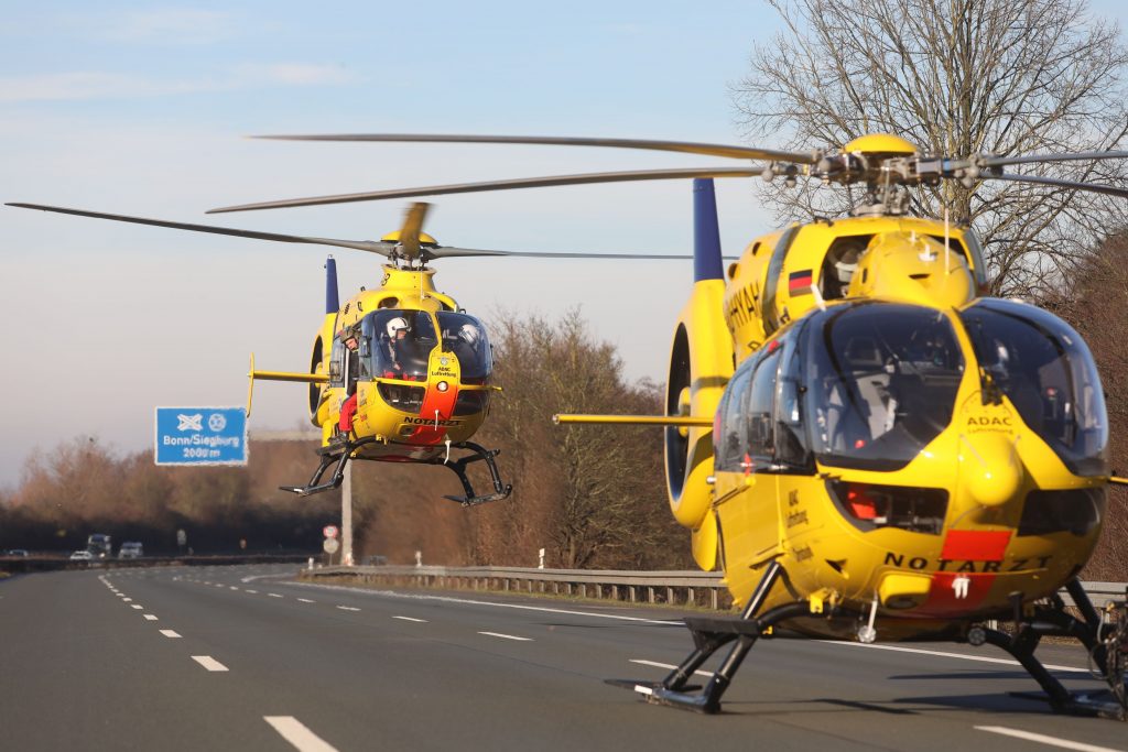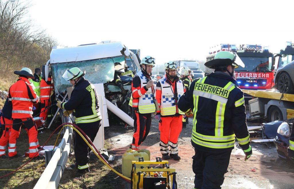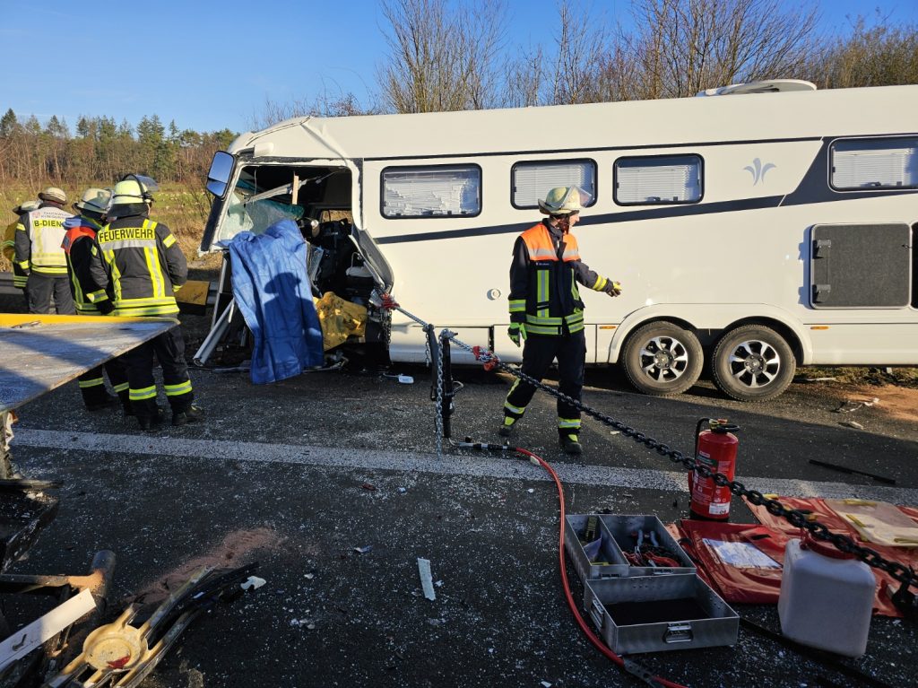 Erneut wurde den Mitgliedern der Freiwilligen Feuerwehr Königswinter „TH3-PKLEMMT“ auf den Meldeempfängern angezeigt. In Fahrtrichtung Köln waren um kurz vor 12 Uhr ein Kleinwagen, ein Abschleppfahrzeug und ein Wohnmobil auf einen stehenden Sattelzug aufgefahren. Bei Eintreffen der Einsatzkräfte lagen Trümmerteile weit verstreut auf der Fahrbahn. Durch eine zufällig vorbeifahrende Polizeibeamtin war die Unfallstelle bereits abgesichert. Die Kollegin konnte eine qualifizierte Lageeinweisung geben. In einem Wohnmobil war der Fahrer zwischen den beiden Sitzen eingeklemmt. Das Fahrzeug war äußerlich und im Innenraum stark zerstört. Teile der Küchenelemente waren durch die Fahrgastzelle geflogen. Seine Ehefrau betreute den eingeklemmten Mann im Fahrzeug. Durch ein notärztlich ausgebildet Mitglied konnte die Feuerwehr noch vor Eintreffen des Rettungsdienstes eine erste Versorgung bieten. Da das moderne Wohnmobil aus Alupanelen in Leichtbauweise gefertigt war, konnten herkömmliche Techniken zur Befreiung kaum angewandt werden. Mit einer Säbelsäge öffnete die Feuerwehr die Karosserie, um an den Patienten zu gelangen. Die ebenfalls schwer verletzte Frau konnte zuerst gerettet werden. Sie war nicht eingeklemmt. Mit einem hydraulischen Rettungsgerät und dem Einsatz von Ketten konnte ein Sitz entfernt und die Einklemmung behoben werden. Von zwei Seiten wurde dabei gearbeitet. Um einen schnelleren Transport zu gewährleisten, wurden zwei Rettungshubschrauber an die Einsatzstelle gerufen. Diese brachten die Schwerverletzten in ein Unfallklinikum. Für den Fahrer besteht Lebensgefahr. Drei weitere beteiligte Personen wurden vom Rettungsdienst untersucht und versorgt. Auslaufende Betriebsstoffe wurden von der Feuerwehr aufgefangen und mit Bindemittel abgestreut. Während der Rettungsmaßnahmen blieb die Autobahn in Fahrtrichtung Köln voll gesperrt. Die Polizei leitete den Verkehr an der Anschlussstelle Siebengebirge ab. Nach knapp drei Stunden konnte die Feuerwehr die Einsatzstelle verlassen Zur Unfallaufnahme wurde ein Unfallaufnahmeteam hinzugezogen. Die Autobahn ist während der Bergungsmaßnahmen weiterhin gesperrt.