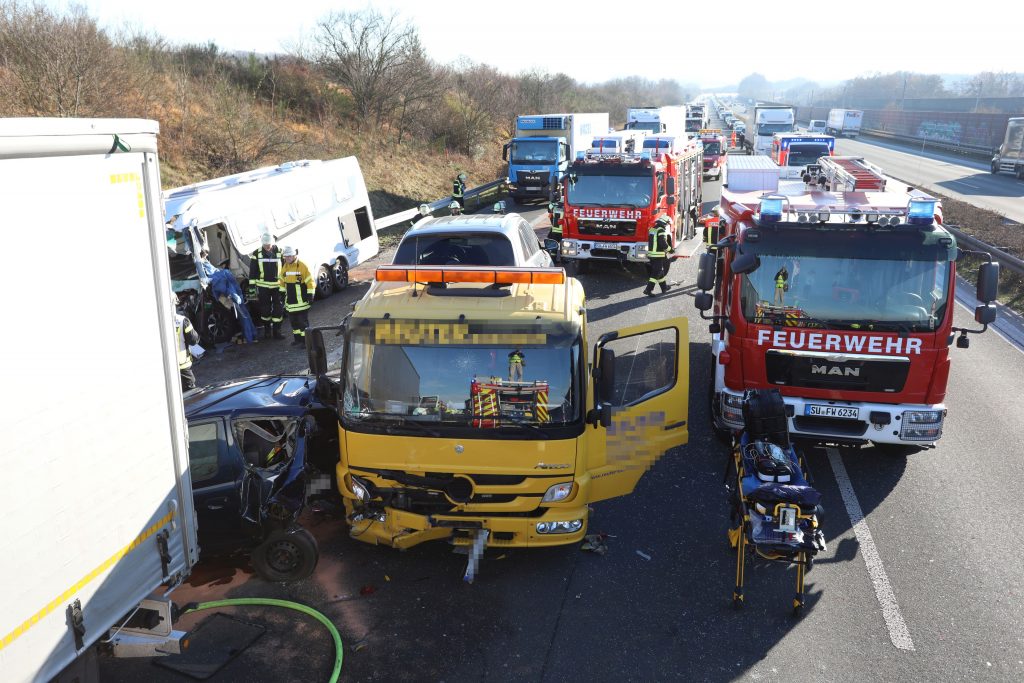 An einem Stauende vor dem Kreuz Bonn / Siegburg kollidierten am Montagmittag mehrere Fahrzeuge. Der Fahrer eines Wohnmobils wurde hierbei eingeklemmt. Er wurde durch die Freiwillige Feuerwehr Königswinter mit technischem Gerät befreit. Insgesamt wurden 5 Personen verletzt.