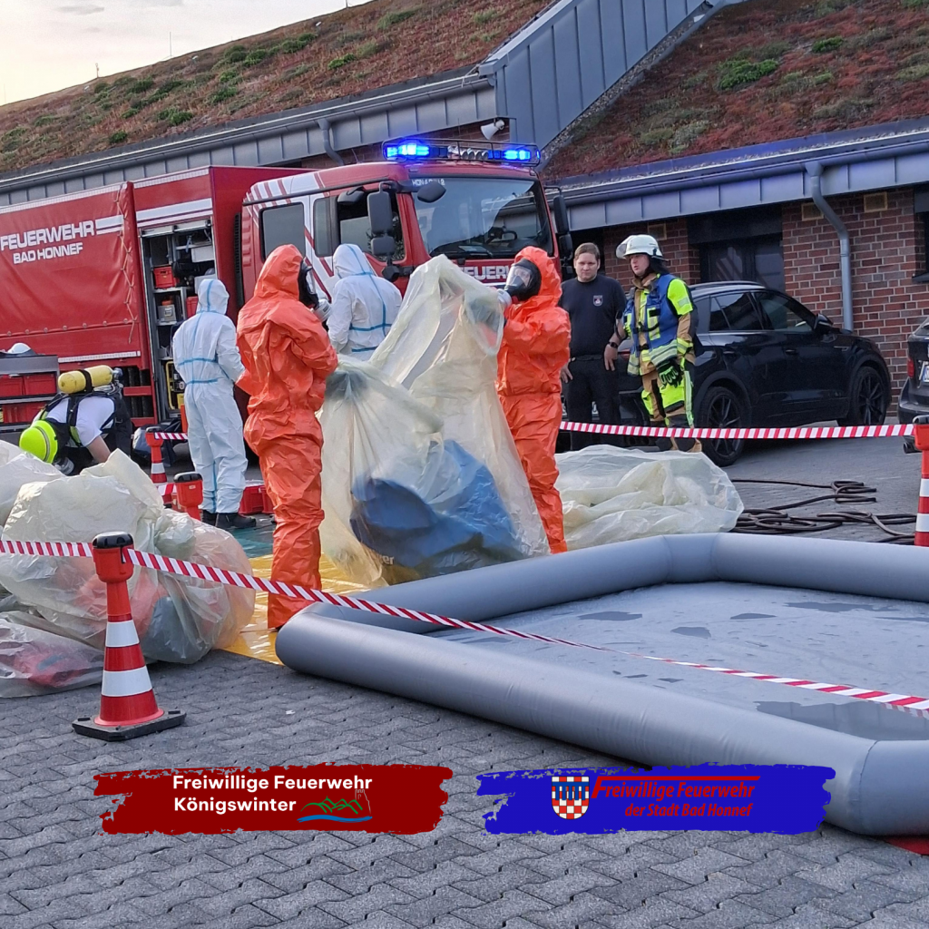 Neben der Zusammenarbeit wurden auch grundlegende Abläufe eines ABC-Einsatzes vertieft. Ein Schwerpunkt lag auf dem fachgerechten Aufbau sowie der Betreuung eines Dekontaminationsplatzes.