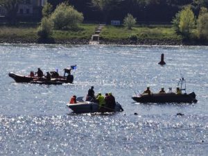 Altstadt, Rheinstrom, Abschnitt 1b. Havariertes Kleinboot nach Wassereinbruch auf Drachenfelser Grund aufgelaufen. Land- und wasserseitige Erkundung. Unterstützung bei Lenzarbeiten. Boot konnte freigeschleppt und in den Honnefer Hafen verbracht werden.