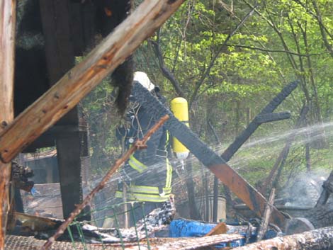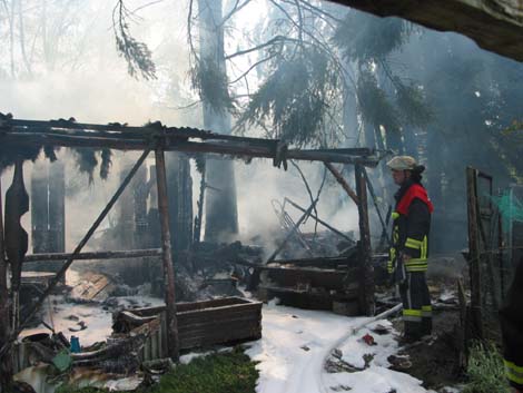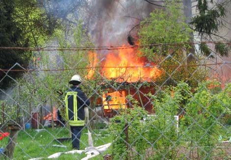 Aus bislang ungeklärter Ursache ist am Montagnachmittag eine Gartenlaube in einem Kleingartengebiet in der Nähe des Oberdollendorfer Waldfriedhofs vollständig abgebrannt. Noch vor Eintreffen der Feuerwehr griffen die Flammen auf in der Nähe stehende Bäume über. Mit dem Einsatz von 2 C- Rohren und 1 B-Rohr konnte die Feuerwehr ein weiteres Ausbreiten verhindern. Ein Feuerwehrmann verletzte sich bei den Löscharbeiten und musste ins Krankenhaus gebracht werden.
