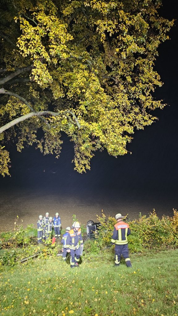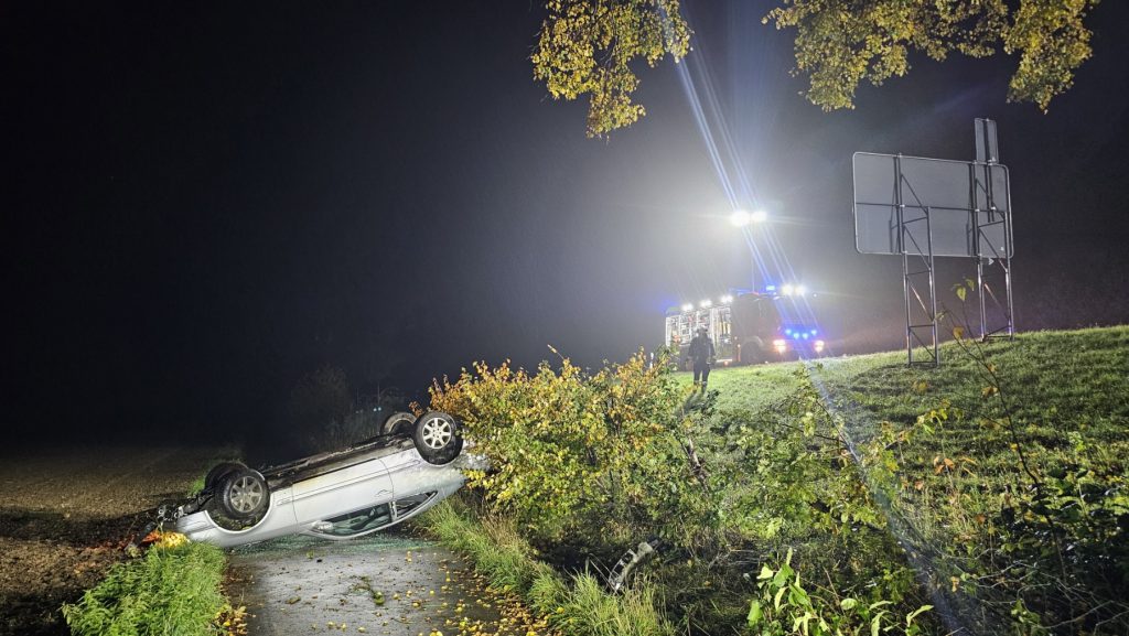 Um 2:01 am Mittwoch wurde der Löschzug Ittenbach zum Verkehrsunfall auf die Landstraße L331 alarmiert. Eine Limousine lag unterhalb der Autobahnauffahrt auf einem Feldweg. Der Fahrer hatte selbstständig das Fahrzeug verlassen. Der Mann wurde durch die Feuerwehr erstversorgt und an den Rettungsdienst übergeben. Er wurde leicht verletzt. Das Fahrzeug war seitlich von der Auffahrt zur Autobahn Fahrtrichtung Frankfurt abgekommen. Nach einem Kontakt mit einem Baum blieb der Wagen auf dem Dach im Feld liegen. Die Einsatzkräfte stellten den Brandschutz sicher. Nach einer Stunde rückten die Kräfte ein. Das Fahrzeug wurde von einem Abschleppunternehmen geborgen.