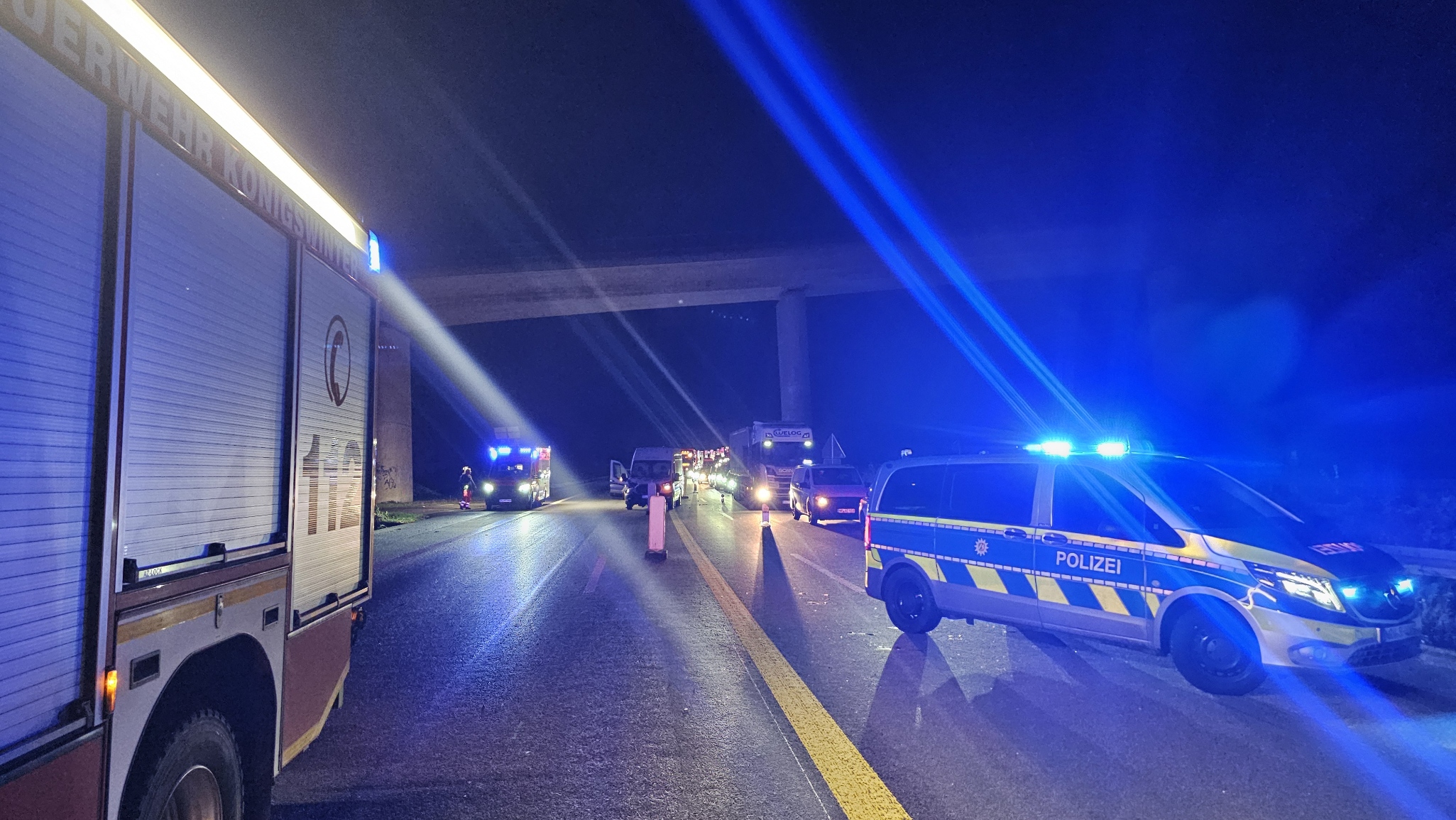 Bei dem Zusammenstoss von zwei Fahrzeugen auf der L143 wurden zwei Personen verletzt. Die Freiwillige Feuerwehr Königswinter sichert die Unfallstelle und streut Betriebsmittel ab. Um…