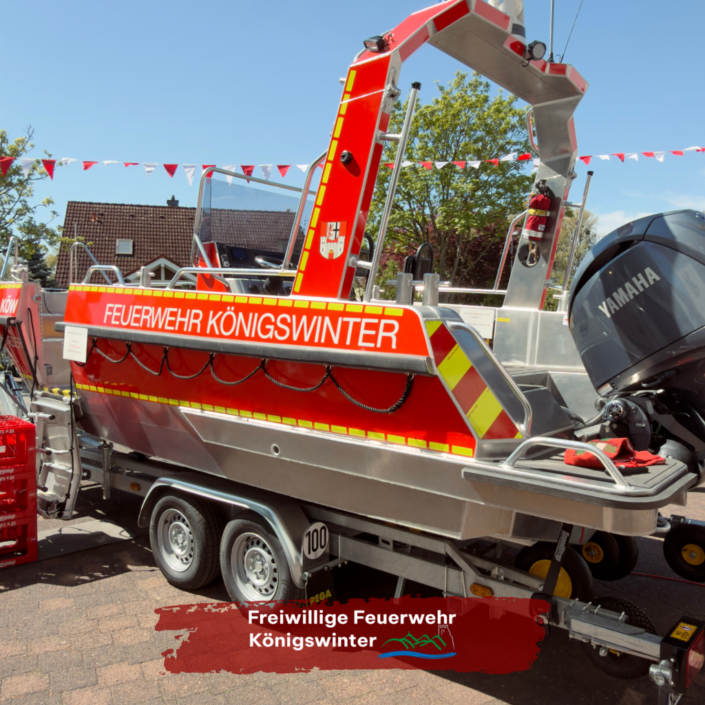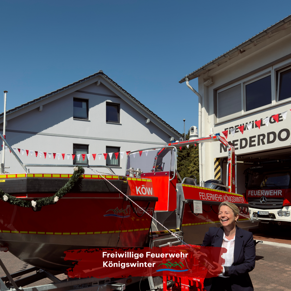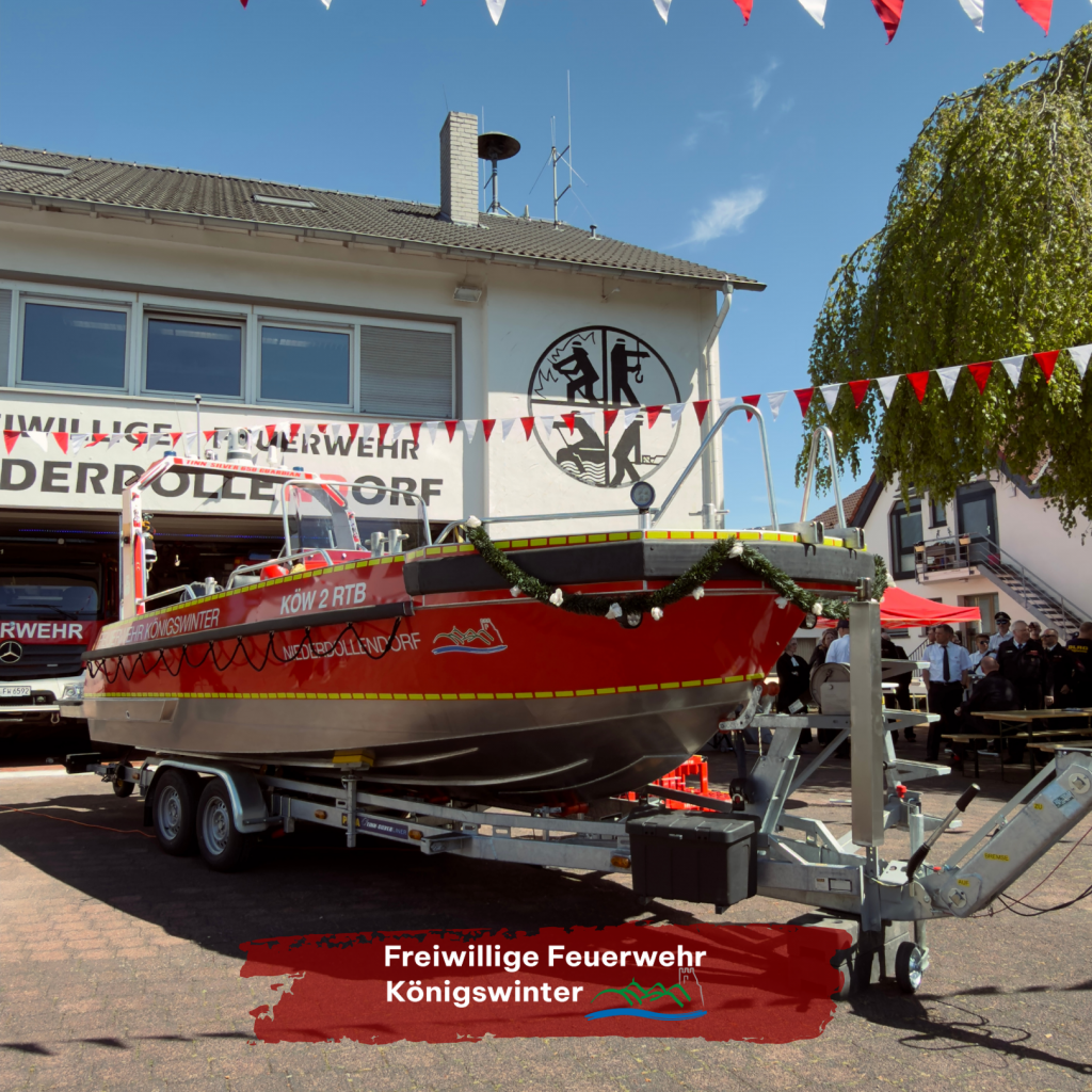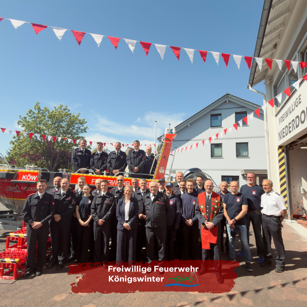 Am vergangenen Sonntag wurde in Niederdollendorf gleich doppelt gefeiert: die Bootstaufe des neuen Rettungsbootes sowie das 127. Gründungsfest der Löscheinheit. Das erst wenige Tage zuvor ausgelieferte Boot wurde durch Pfarrer Markus Hoitz und Pfarrerin Sophia Döllscher gesegnet und von Bürgermeisterin Heike Jüngling getauft, bevor es offiziell übergeben wurde. Zahlreiche Gäste aus Politik, Feuerwehr und Feuerwehrverwaltung waren vor Ort, darunter der Leiter der Feuerwehr Michael Bungarz, sein Stellvertreter Jens Bellinghausen sowie Vertreter der DLRG Königswinter.