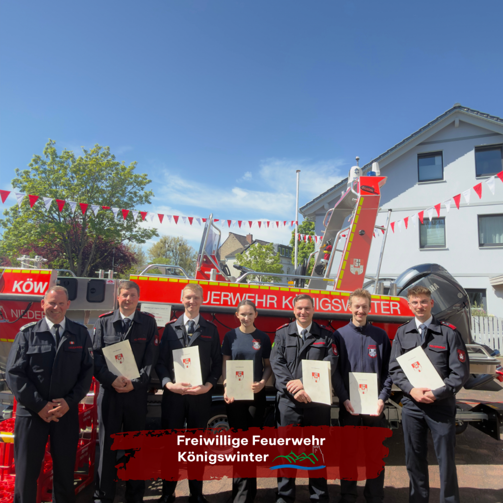 Darüber hinaus wurden mehrere Beförderungen ausgesprochen: Celina Sophie Pieger wurde zur Feuerwehrfrauanwärterin ernannt, Tim Berger zum Feuerwehrmann und Duncan Pieger zum Oberfeuerwehrmann befördert. Luca Donatelli erhielt nach bestandener Truppführerausbildung den Dienstgrad Unterbrandmeister. Für ihre 40-jährige Mitgliedschaft in der Freiwilligen Feuerwehr Königswinter wurden außerdem Martin und Andreas Leischner, Martin Schwabe sowie Oliver Bracht geehrt.