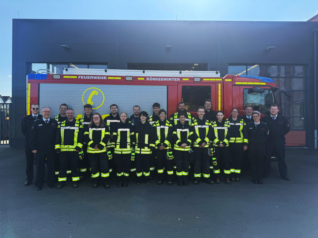Am heutigen Tag konnten 16 Teilnehmende der Freiwilligen Feuerwehr Königswinter Modul 1 und 2 der insgesamt vier Abschnitte der Grundausbildung erfolgreich abschließen. Die Prüfung fand im Feuerwehrhaus Oberdollendorf statt.
