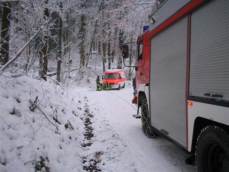Ein Kind war am Vormittag auf der Wiese unterhalb des Löwenburgerhofs gegen einen Baum gefahren. Ein vom DRK Königswinter entsandter Rettungswagen fuhr sich auf der Anfahrt fest, so dass sich ein Rettungsassistent zu Fuß auf den Weg zur Einsatzstelle begeben musste. Währenddessen wurde um 11.31 Uhr die Löschgruppe Ittenbach zur Unterstützung alarmiert. Das Aufziehen der Schneeketten war nach drei Einsätzen am gestrigen Tage Routine, so dass die Wehrleute schnell den Einsatzort erreichten. Zunächst wurde das Kind mit einer so genannten Schleifkorbtrage zu einem Feuerwehrfahrzeug getragen. Hiermit erfolgte im Anschluss auch der Transport über die schneeglatten Waldwege zur Magarethenhöhe. Dort konnte die junge Patientin schließlich in einen bereitstehenden städtischen Rettungswagen umgeladen und mit mittelschweren Verletzungen in ein Krankenhaus transportiert werden. Parallel wurde der in einem Graben festgefahrene Rettungswagen des Roten Kreuzes von der Feuerwehr mittels Seilwinde aus seiner misslichen Lage befreit.