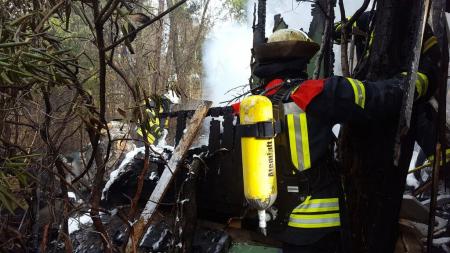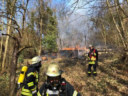 Um 13.05 Uhr am Montag wurden die Ehrenamtlichen nun erneut zu der Kleingartenanlage im Nachtigallental gerufen. Die vom ersten Brand betroffene Holzhütte stand nun in voller Ausdehnung in Flammen. Erneut gingen die Einsatzkräfte zur Brandbekämpfung unter Atemschutz vor. Auch hier waren die drei Einheiten aus dem Talbereich der Stadt Königswinter rund 1,5 Stunden vor Ort.
