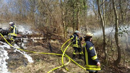 Gegen 10 Uhr waren es mehrere Anrufer, die von Rauch aus dem Bereich des Nachtigallentals in der Altstadt berichteten. Dort brannte in einer in Hanglage befindlichen und schwer zugängigen Kleingartenanlage Unrat. Das Feuer hatte sich bereits vor Eintreffen erster Einsatzkräfte auf eine Holzhütte ausgedehnt. Diese wurde hierbei stark beschädigt. Mit Hilfe von 2 C-Rohren wurde das Feuer gelöscht sowie ein Schaumteppich aufgebracht. Nach Kontrolle mit Hilfe der Wärmebildkamera konnten die 25 Wehrleute der Einheiten Altstadt und Oberdollendorf gegen 11.30 Uhr wieder abrücken. Unterstützung aus Niederdollendorf war hier nicht mehr erforderlich.