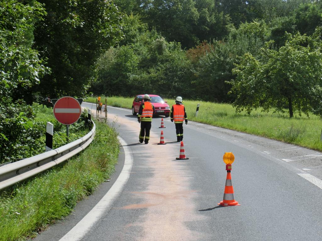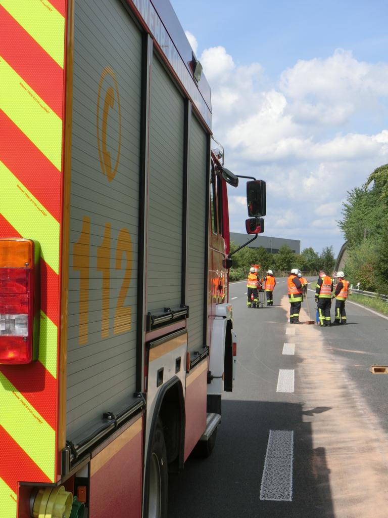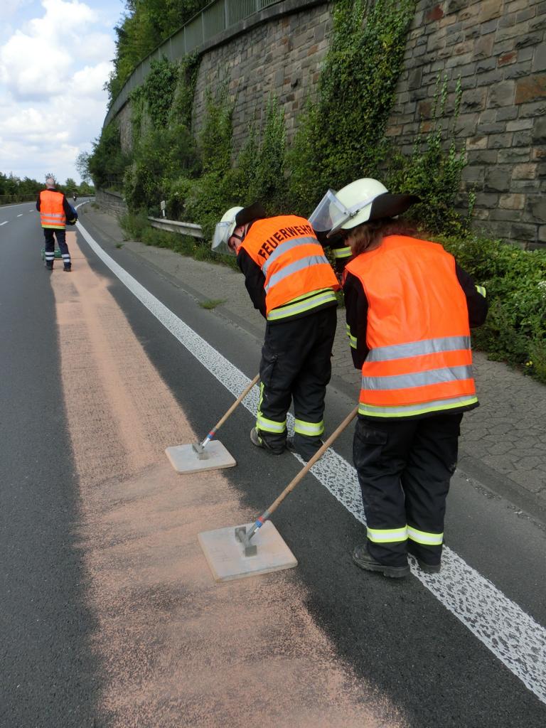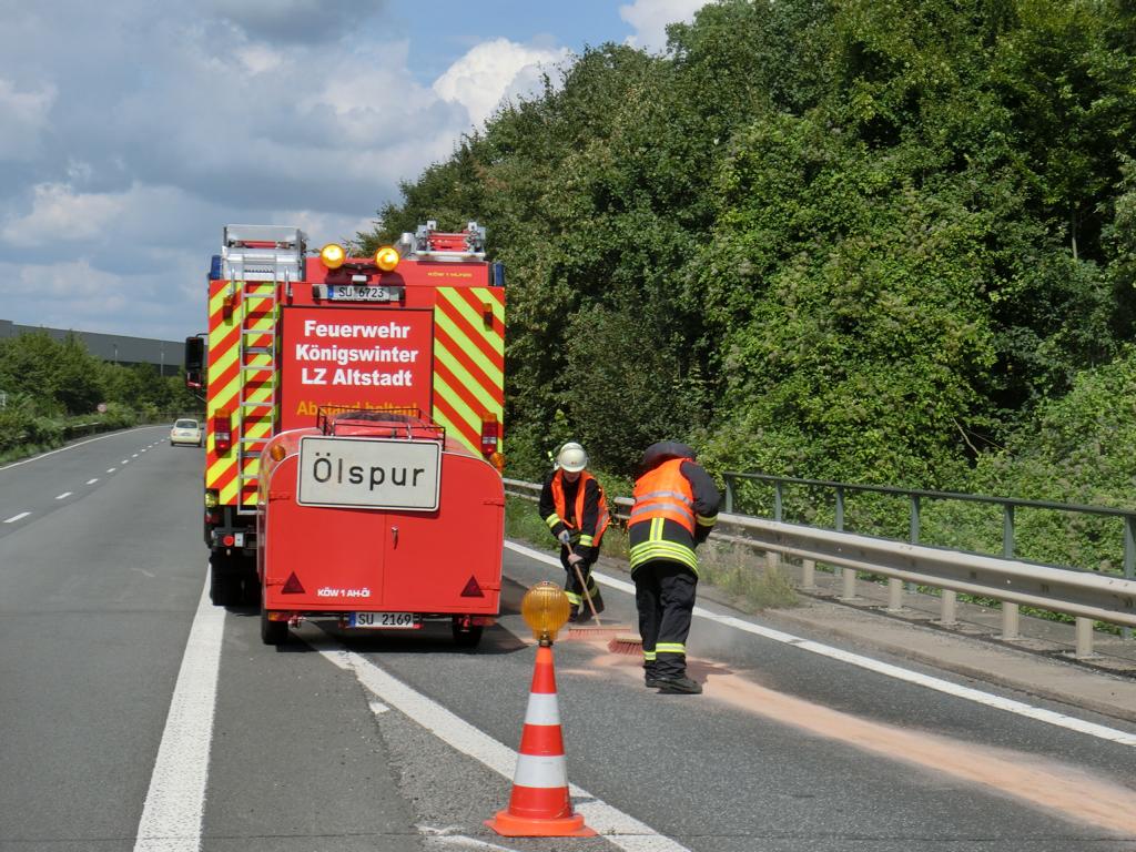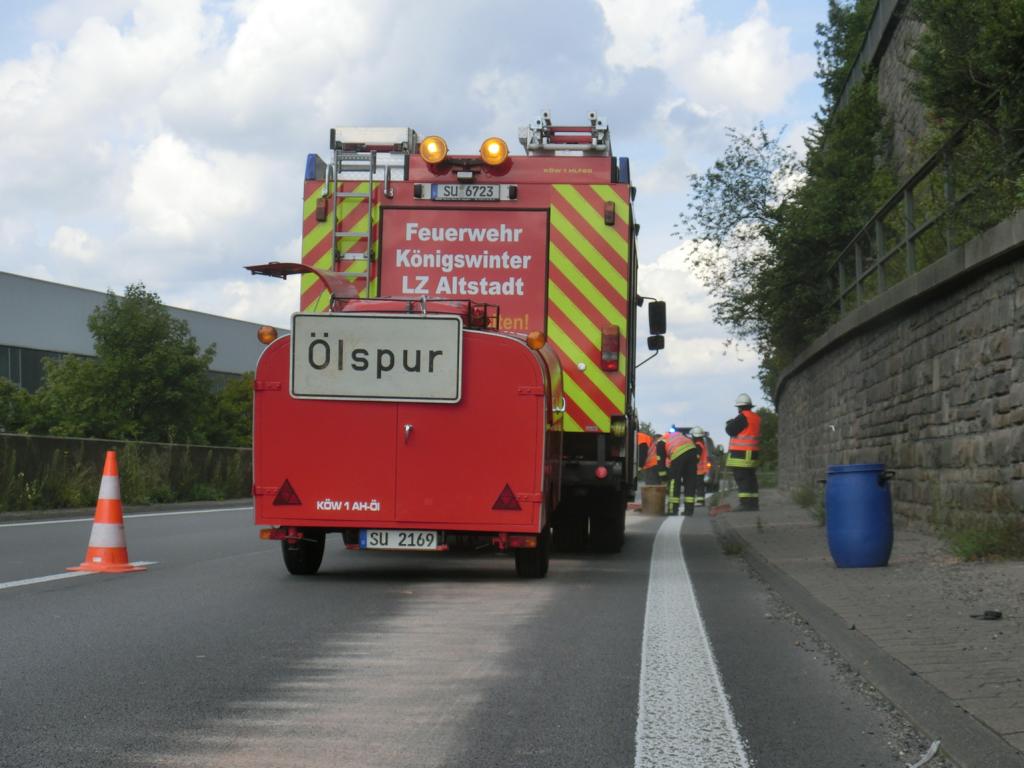 B 42, Auffahrt Königswinter in Fahrtrichtung Bonn. Ca. 300m Öl- bzw. Kraftstoffspur im Bereich der Auffahrt sowie der rechten Richtungsfahrbahn abgestreut und aufgenommen.