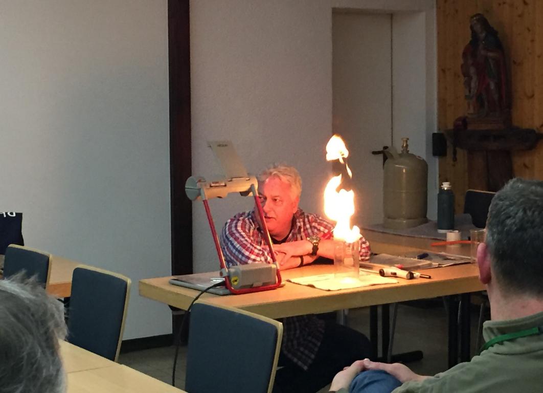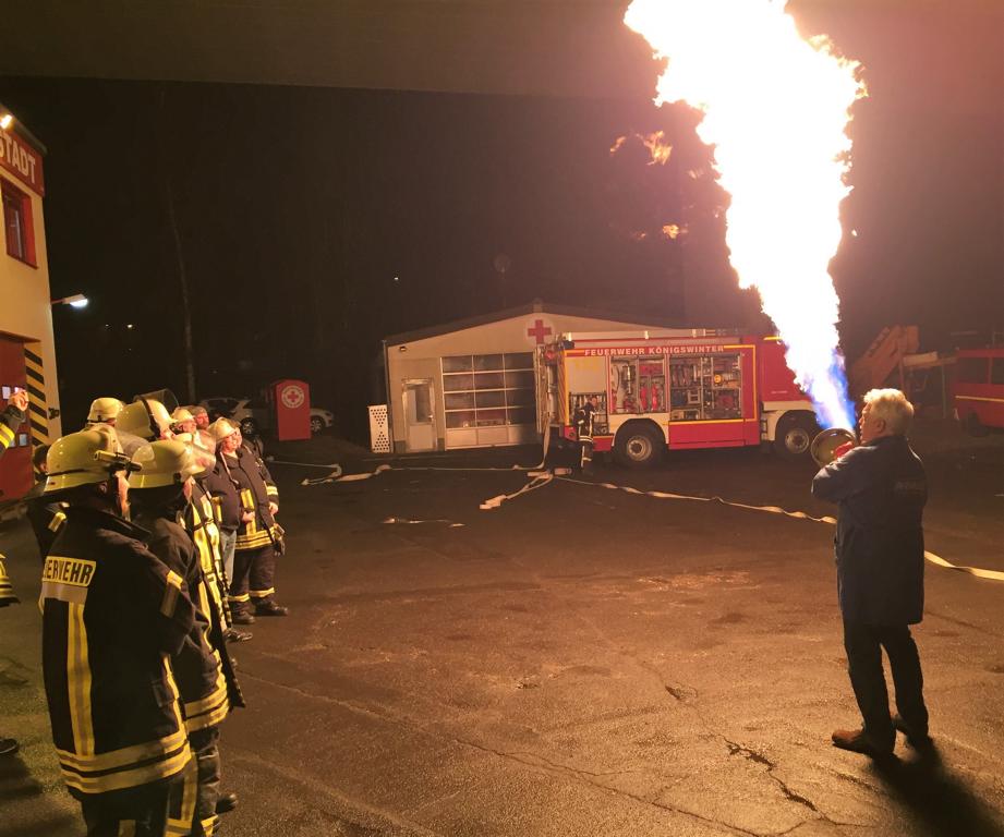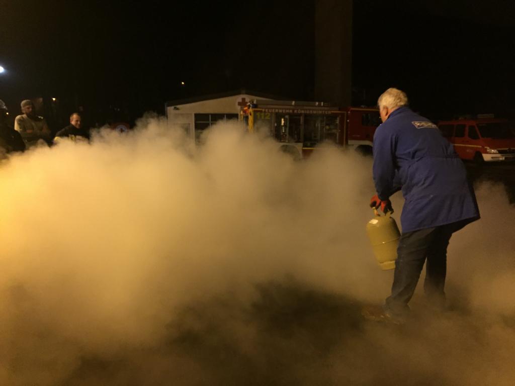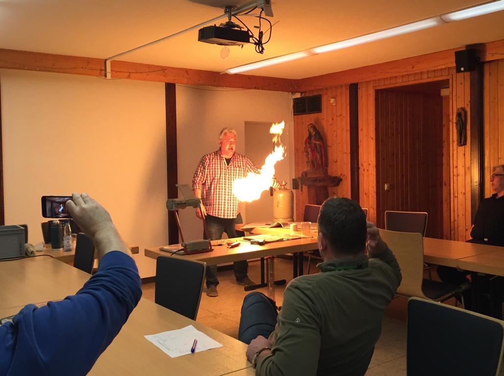 Im Rahmen des Übungsabends am 16.02.2017 wurde den Kameraden der Umgang mit dem Medium Gas vermittelt. Kurz nach Unterrichtsbeginn rückten die ersten Stühle schon ein Stück weiter nach hinten, als Dozent Frank Hegner, Mitarbeiter der Rheingas in Brühl, die Gasflasche mitten im Schulungsraum aufdrehte und das Feuerzeug zückte. Der beigemischte Geruchsstoff macht sich sofort breit. „Respekt ist wichtig und der richtige Umgang mit Gas an der Einsatzstelle natürlich auch, aber Angst braucht Ihr keine zu haben“. Während des Theorieteils wurde den Kameraden die physikalischen Eigenschaften erläutert. „Schwerer oder leichter als Luft, giftig oder ungiftig, brennbar oder nicht brennbar – diese Fragen müssen an der Einsatzstelle als erstes geklärt werden, daraus resultieren die weiteren Maßnahmen“. Im flüssigen Zustand hat Gas eine Temperatur von circa -40° Celsius. Die von Frank Hegner in das Flüssiggas getauchte Blume zerfällt anschließend in unzählige Bruchstücke.