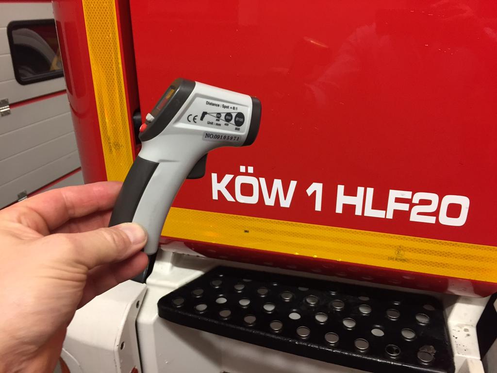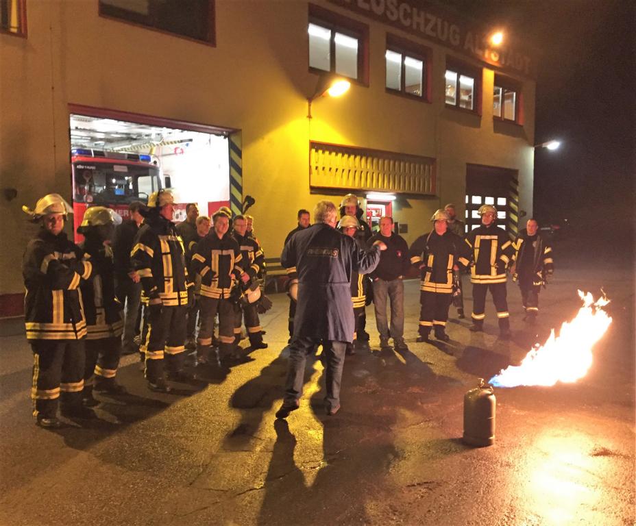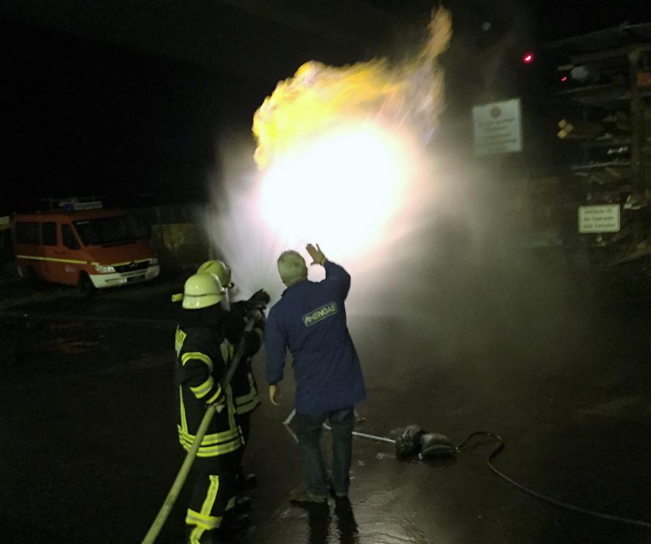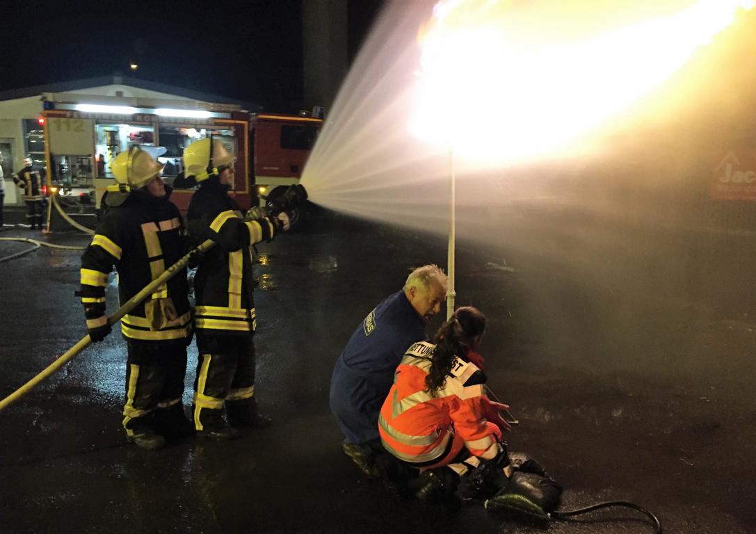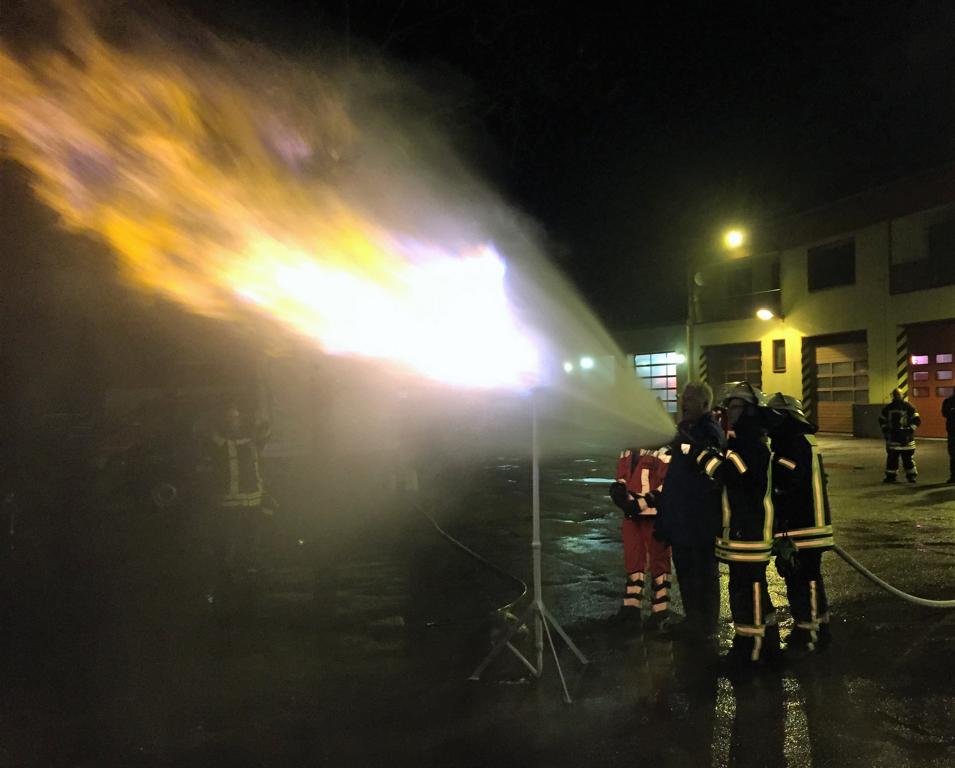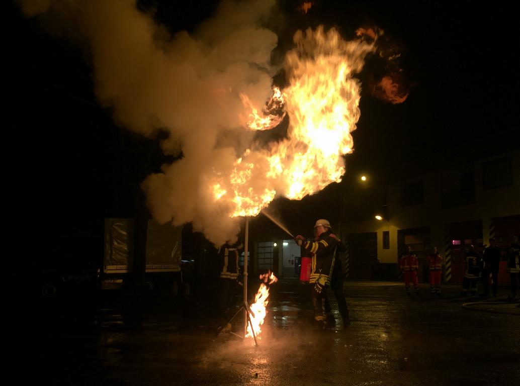 Die anderen Versuche finden auf dem Hof statt. Der Dozent entzündet Gas, das aus einer Flasche entweicht und erklärt, dass auch hier keine Gefahr für die Kräfte besteht. Auch erläutert er, wie erwärmte Flaschen und Tanks richtig gekühlt werden. „Viel hilft viel“ ist hier nicht das Mittel der Wahl. Abschließend hatten alle Kameraden die Möglichkeit an der Gasfackel zu üben. Die Flamme konnte problemlos mittels Hohlstrahlrohr eingefangen und in Schach gehalten werden.