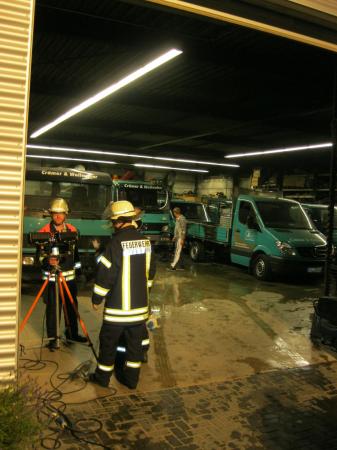 Um 22.52 Uhr war am Dienstagabend ein Großaufgebot mit dem Einsatzstichwort „vermutlich brennende Lagerhalle“ zu dem Einsatz in der Eduard-Rhein-Straße im Gewerbegebiet Königswinter-Ruttscheid alarmiert worden. Der Bewohner einer Wohnung auf dem Gelände des dort ansässigen Gartenbauunternehmens war auf einen Brand in der firmeneigenen Lagerhalle aufmerksam geworden. Er alarmierte umgehend die Feuerwehr. Beim Eintreffen der ersten Fahrzeuge war die Halle, in der u.a. zahlreiche Firmenfahrzeuge eng aneinander abgestellt waren, vollständig verqualmt. Feuerschein war von außen erkennbar. Kräfte gingen, geschützt vor dem Rauch mit Preßluftatmern, in die Halle von mehreren Seiten vor. Schnell konnte ein Feuer im Bereich der Ladefläche eines Kleintransporters lokalisiert werden. Bereits um 23.15 Uhr konnte Einsatzleiter Oberbrandmeister Ralf Pütz an die Siegburger Feuer- und Rettungsleitstelle melden, dass das Feuer unter Kontrolle sei. Parallel zu den Löscharbeiten war die Halle intensiv nach möglicherweise dort noch befindlichen Personen abgesucht worden. Das konnte im Anschluss ausgeschlossen werden. Auch ging die Drehleiter für mögliche Brandbekämpfungsmaßnahmen von außen in Bereitschaft. Nach Abschluss der Löscharbeiten wurde der Rauch mittels Überdrucklüfter aus der Halle herausgedrückt. In dieser Phase war erkennbar, dass ein Übergreifen auf unmittelbar neben dem Brandfahrzeug abgestellte LKW in letzter Sekunde verhindert worden war. Das stark beschädigte Brandfahrzeug wurde aus der Halle entfernt.