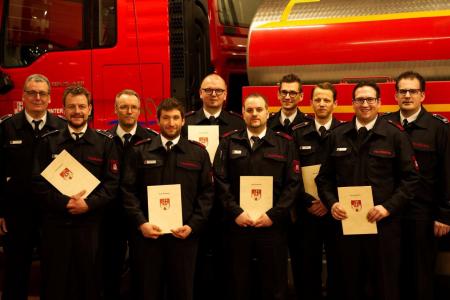 Bei der Jahreshauptversammlung konnten durch Löschzugführer Martin Ehrenberg und Stadtbrandinspektor Michael Bungarz einige Beförderungen ausgesprochen werden. So wurde Stefan Düsterhöft zum Feuerwehrmann, Sven Füllenbach und Björn Mohr zu Oberfeuerwehrmännern und Sebastian Stucken zum Hauptfeuerwehrmann befördert. Den Dienstgrad Unterbrandmeister erreichte Sebastian Thanos, Marc Wendt ist nun Brandmeister sowie der stellvertretende Löschzugführer Nicolai Harbort Brandinspektor.