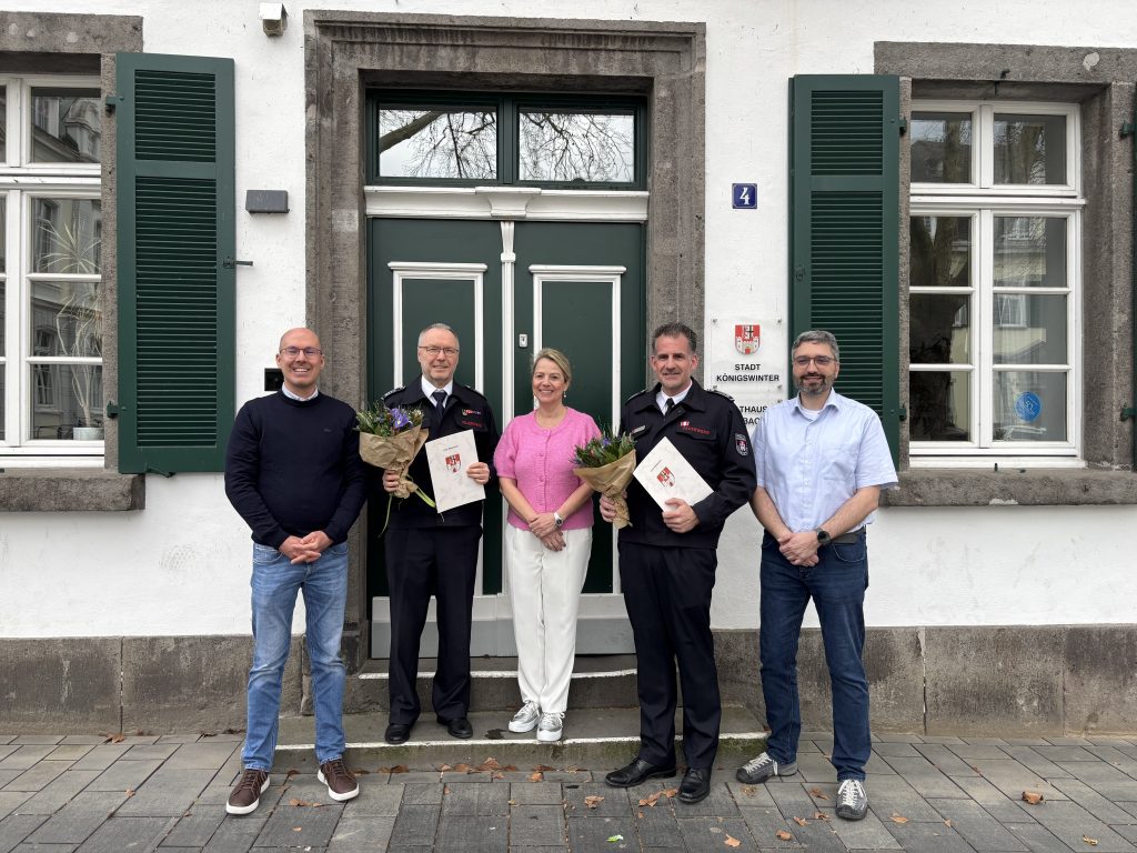 Der Rat der Stadt Königswinter hatte die Bestellung der neuen Leitung in seiner Sitzung am 2. März 2026 auf Vorschlag von Kreisbrandmeister Stefan Gandelau beschlossen. An der nun erfolgten Übergabe der Bestellungsurkunden durch Bürgermeisterin Heike Jüngling nahmen aus der Fachverwaltung auch Geschäftsbereichsleiter Nicolas Klein und Servicebereichsleiter Frank Ruppert teil. Heike Jüngling bedankte sich für die Bereitschaft, diese Ämter zu übernehmen, und freut sich auf die weitere Zusammenarbeit.