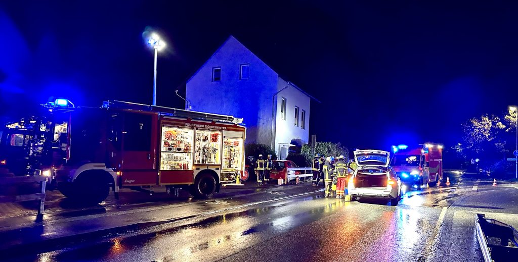 Thomasberg, Dollendorfer Straße. Nach einem Alleinunfall eines PKW-Fahrers kam dessen Fahrzeug mittig auf der Straße zum Stehen. Der PKW war nach Leitplankenkontakt nicht mehr zu bewegen. Austretende Stoffe waren nicht erkennbar. Der leicht verletzte Patient wurde bereits vom Rettungsdienst betreut. Die Feuerwehr stellte den Brandschutz sicher, leuchtete die Unfallstelle aus und unterstützte die Polizei bei der Sperrung der Straße.