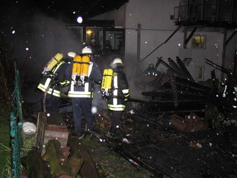 Der Brand eines Schuppens in der Straße Plätzer Weg in Quirrenbach, der in unmittelbarer Nähe zu einem Wohnhaus stand, hat am späten Freitagabend rund 70 Mitglieder der Freiwilligen Feuerwehr Königswinter alarmiert. 3 Einsatzkräfte erlitten Rauchvergiftungen, als sich bei ersten Brandbekämpfungsmaßnahmen der Wind auf Grund von Sturmböen plötzlich drehte. Ein Übergreifen des Feuers auf das Wohnhaus konnte verhindert werden, der Schuppen brannte jedoch vollständig ab.