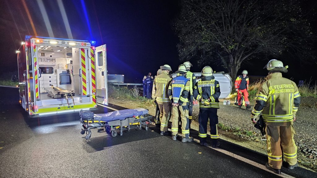 „Person eingeklemmt“ lautete die Alarmierung am Dienstag um 22:24 Uhr für die Freiwillige Feuerwehr Königswinter. Auf der Autobahn A 3 war ein PKW in der Anschlussstelle Siebengebirge von der Abfahrt abgekommen. Der Mittelklassewagen blieb auf dem Grünstreifen auf der Seite liegen. Bei Eintreffen der Rettungskräfte bestätigte sich das Meldebild nicht. Der Mann konnte ohne technische Mittel befreit werden. Den Einsatzkräften des Löschzuges Ittenbach wurde schnell kommuniziert, dass es sich um eine Polizeilage handelte. Unter Polizeischutz wurde der Verletzte dem Rettungsdienst übergeben. Nachrückende Kräfte der Löschzüge Oelberg und Uthweiler konnten die Anfahrt abbrechen. Im Laufe des Einsatzes unterstützte die Feuerwehr bei polizeilichen Maßnahmen. So wurde der Unfallwagen zwecks Durchsuchung des Innenraumes mit der Seilwinde auf die Räder gedreht. Auslaufende Betriebsmittel wurden aufgenommen und der Brandschutz gesichert. Für die Feuerwehr endete der Einsatz nach drei Stunden. Zum genauen Sachverhalt verweisen wir an die Polizei.