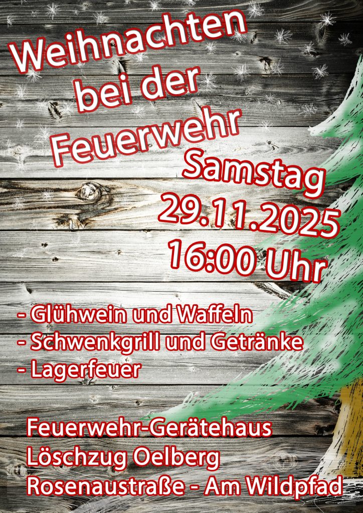 Am Samstag, den 29.11. veranstaltet der Löschzug Oelberg einen weihnachtlichen Abend. Ab 16 Uhr öffnen Tür und Tor des Feuerwehr-Gerätehauses an der Kreuzung Rosenaustraße / Am Wildpfad für Groß und Klein. Für Getränke und Speisen ist gesorgt. Der Nikolaus hat sich bereits angekündigt.