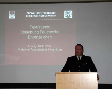 Der Dienst am Nächsten hat im Leben von 11 Mitgliedern der Freiwilligen Feuerwehr Königswinter stets eine besondere Rolle gespielt. Die Stadt Königswinter würdigte die Jubiläen im Rahmen eines Empfangs in der Hirschburg, der Seminarstätte der Vodafone D2 GmbH. Bürgermeister Peter Wirtz und Stadtbrandinspektor Michael Bungarz überreichten Stefan Hombeuel, Ernst Willi Kiedels, Thomas Klingmüller, Jörg Lancier, Rüdiger Otto, Andreas Schmitz, Lutz Schumacher, Uwe Steffes und Gereon Zimmerling in Anerkennung ihrer Leistung für 25 jährige Zugehörigkeit das Feuerwehrehrenzeichen in Silber. Peter Koll und Willi Nitzke, die bereits 35 Jahre der Feuerwehr angehören, erhielten das Feuerwehrehrenzeichen in Gold.