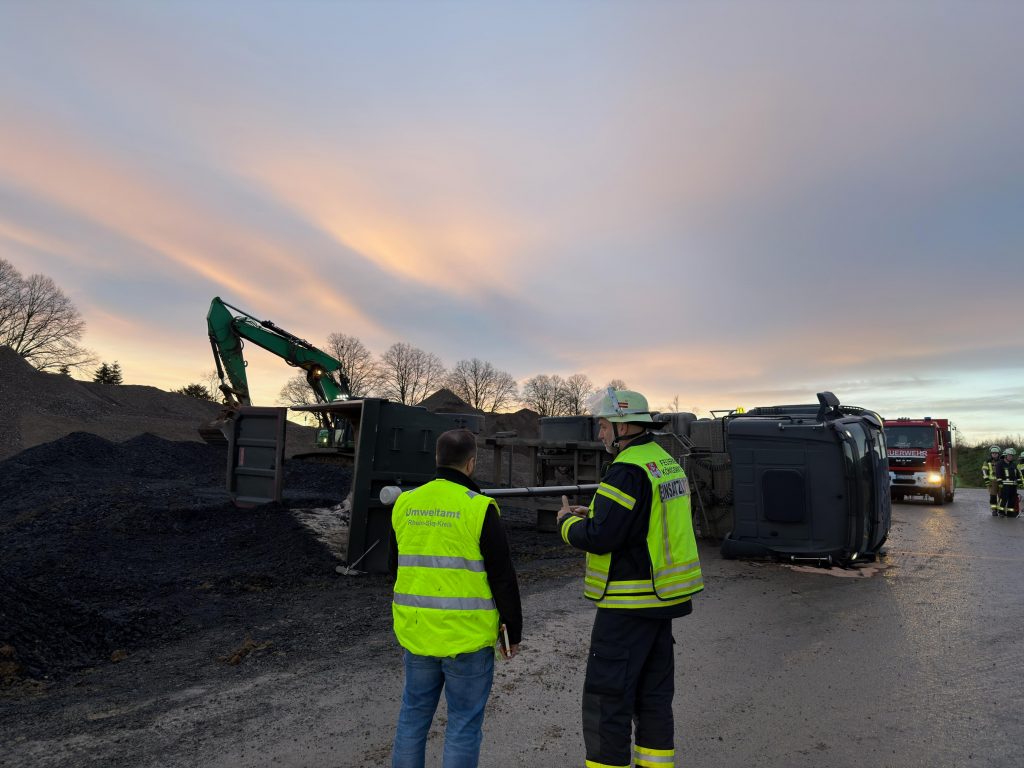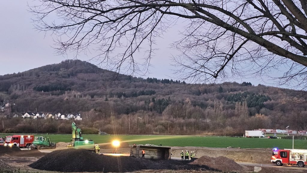 Der Zwischenfall ereignete sich kurz nach sieben Uhr auf dem Schüttgutlagerplatz neben der Autobahnauffahrt Siebengebirge. Beim Kippvorgang stürzte das Baufahrzeug auf die Seite. Um 07:14 Uhr wurde der Löschzug Ittenbach zur Technischen Hilfeleistung alarmiert.